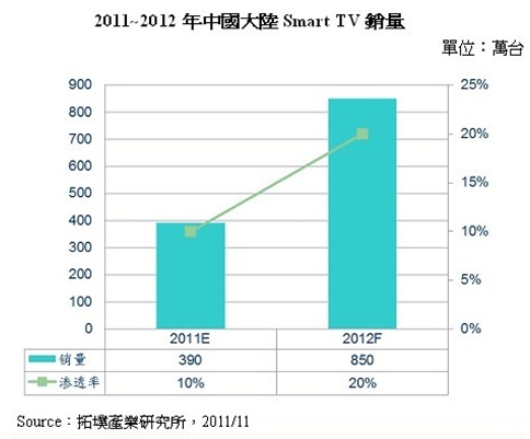 - 2012年中國大陸Smart TV銷售量將達(dá)850萬臺