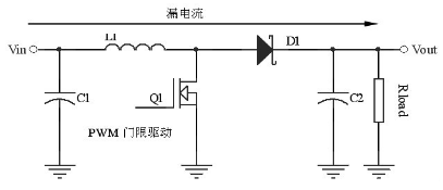 (1)電池使用壽命短:圖2 中,即使關(guān)斷升壓轉(zhuǎn)換器主開關(guān),Vin 與Vout 之間仍會形成一條電流泄露路徑,如果在輸出端接有任何負(fù)載,其中泄露電流Ileak 接近于Vin/Rload,那么漏電流的存在使的蓄電池一直處于工作狀態(tài),這樣將會縮短電池的使用壽命。