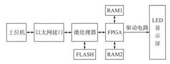 系統(tǒng)采用新一代的32bitRISC處理器STM32作為主控芯片,通過(guò)以太網(wǎng)傳輸數(shù)據(jù),以FLASH作為存儲(chǔ)模塊,由FPGA完成對(duì)LED顯示屏的高速掃描刷新。系統(tǒng)工作時(shí),利用上位機(jī)編輯顯示信息,通過(guò)以太網(wǎng)接口將顯示信息傳輸給微處理器,微處理器接收數(shù)據(jù)信息后寫(xiě)入FLASH存儲(chǔ)器。在顯示時(shí),微處理器讀取FLASH中的數(shù)據(jù),通過(guò)總線將數(shù)據(jù)以并行方式發(fā)送給FPGA,FPGA處理后將數(shù)據(jù)傳輸?shù)絃ED顯示屏顯示。