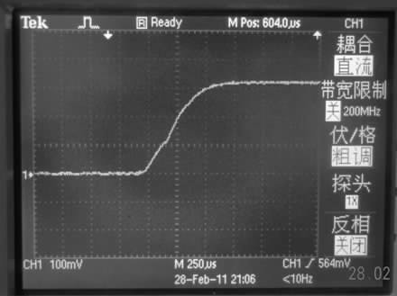 通過模擬可初步選擇40 mH 的電感作為驅(qū)動電路所用, 圖3 是用示波器采到的電壓波形圖, 此電壓是電路中串聯(lián)了一個20 Ω 的電阻上的電壓, 穩(wěn)定后電壓為340 mV, 即電路中電流為17 mA.因?yàn)閷?shí)際電路中電流有損耗, 所以實(shí)際電流值比模擬電流值偏小, 但整個電流的變化趨勢與模擬基本一致。