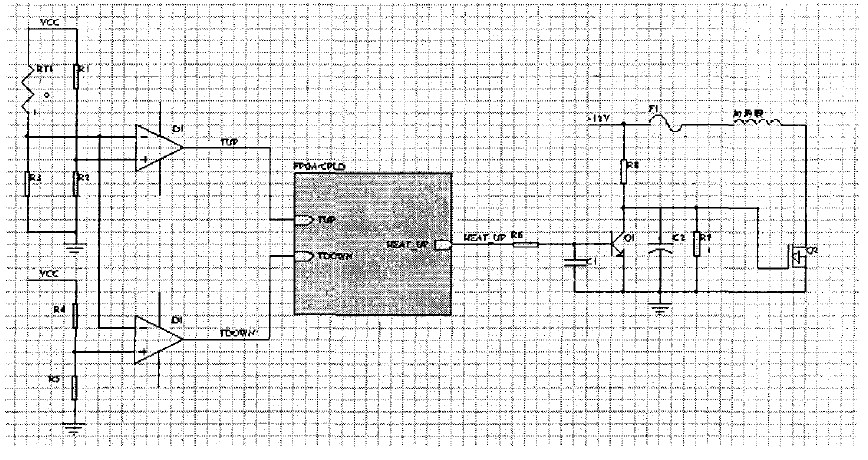加熱電路包括FPGA/CPLD、溫度傳感器、比較器、加熱控制開(kāi)關(guān)、加熱器件等,電路圖如圖1。
