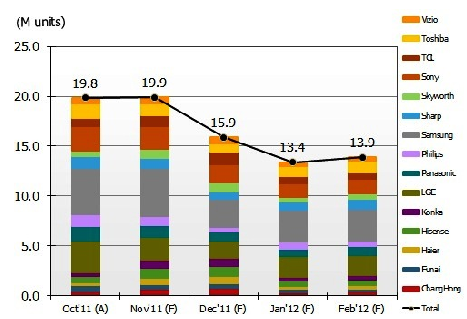 NPD DisplaySearch認為,盡管北美和中國大陸的銷售實績強勁,液晶電視品牌商仍謹慎管控庫存。從12月到 2012年2月,液晶電視品牌計劃降低生產(chǎn)數(shù)量以預防在傳統(tǒng)的第一季淡季堆積過多的庫存。在全球液晶電視品牌生產(chǎn)計劃調(diào)查中顯示, 2012年1月的整機生產(chǎn)量將降到1,340萬臺的數(shù)量,而液晶電視面板業(yè)者則將需在未來的幾個月持續(xù)控制產(chǎn)能利用率,即使面板價格轉(zhuǎn)為穩(wěn)定。