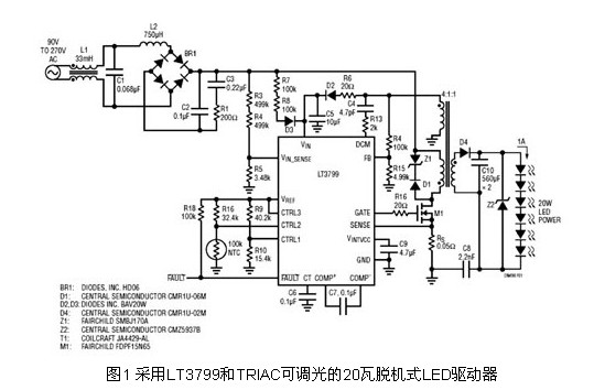 為了滿足脫機式照明的要求,例如高功率因子、高效率、隔離和TRIAC調(diào)光器兼容性,先前的LED驅(qū)動器采用很多外部分立式組件,結(jié)果形成了既龐大又復(fù)雜的解決方案。而最新的驅(qū)動器LT3799則整合了脫機式LED照明需要的所有功能,解決了相關(guān)復(fù)雜性、空間和效能問題。LT3799是一款具主動功率因子校正的隔離反馳式LED控制器,專門為在90~265VAC的通用輸入范圍驅(qū)動LED而設(shè)計。該組件以關(guān)鍵導(dǎo)通(邊界)模式控制一個隔離反馳式轉(zhuǎn)換器,適用于需要4~100瓦或更高LED功率的LED應(yīng)用。其新穎的電流檢測電路無須使用光耦合器,就能向二次側(cè)提供良好調(diào)節(jié)的輸出電流。其獨特的泄能(Bleeder)電路使得LED驅(qū)動器可與TRIAC調(diào)光器兼容,而無須增設(shè)額外的組件。LED開路和短路保護則可確保長期可靠性。