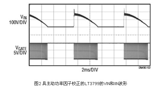 透過使線路電流跟隨施加的正弦波電壓,這種高功能整合的驅(qū)動電路實現(xiàn)了高功率因子,并且滿足了IEC 61000-3-2 C類照明設(shè)備諧波要求。如果所吸取的電流與輸入電壓成正比,就能實現(xiàn)等于1的功率因子。其用一個從輸入電壓產(chǎn)生并與輸入電壓成比例的電壓調(diào)制峰值開關(guān)電流。如圖2所示,這種方法提供0.98或更高的功率因子。一個小帶寬回饋環(huán)路保持對輸出電流的調(diào)節(jié),而且不會使輸入電流失真。