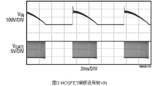當TRIAC調(diào)光器處于斷開狀態(tài)時,其實不是徹底斷開的。有相當大的漏電流通過其內(nèi)部濾波器流至LED驅(qū)動器。這個電流為LED驅(qū)動器的輸入電容器充電,進而導(dǎo)致LED隨機開關(guān)和閃爍。過往的解決方案是增加一個泄能電路,該電路包括一個大且昂貴的高壓金屬氧化物半導(dǎo)體場效晶體管(MOSFET)。LT3799將變壓器一次側(cè)繞組和主開關(guān)用作泄能電路,因此無需這類MOSFET或其他任何額外的組件。如圖3所示,當TRIAC斷開時,MOSFET閘極訊號為高,且MOSFET接通,進而泄放掉漏電電流,并保持輸入電壓為 0伏特(V)。TRIAC一導(dǎo)通,MOSFET就無縫地變回正常的供電組件。