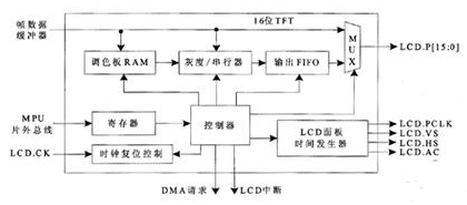 LCD控制模塊的數(shù)據(jù)通道由調(diào)色板RAM、灰度/串行器和輸出FIFO這3個(gè)部分組成。這3個(gè)部分支持12或16位STN方式,由控制器控制輸出數(shù)據(jù)到LCD的數(shù)據(jù)總線上。而對(duì)于16位薄膜工藝學(xué)(TFT,Thin ̄Film Technology)方式,數(shù)據(jù)直接傳輸?shù)絃CD的總線,提供2(16)=64K的彩色信號(hào)。