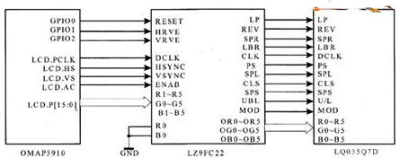 LCD驅(qū)動(dòng)電路和0MAP5910的迕接如圖2所示。使用OMAP5910的LCD控制器接口連接LZ9FC22。LZ9FC22是Sharp公司專門配合LQ035Q7D型號(hào)LCD的驅(qū)動(dòng)芯片,可以和LQ035Q7D進(jìn)行無(wú)縫連接。