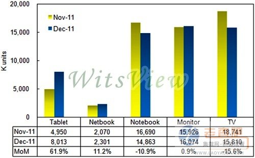 根據(jù)WitsView的最新 2011年12月份大尺寸面板出貨調查報告顯示,12月份大尺寸面板出貨,較11月份減少2.3%,出貨總量為5,706萬片,較2010年同期衰退8.7%。隨著下游廠商旺季備貨告一段落,整體市場對各應用別面板需求開始趨緩,12月初,液晶電視面板出貨在中國市場,尚有小部分的農(nóng)歷春節(jié)備貨需求支撐,但整體電視面板出貨總量僅來到1,581萬片,月減15.6%。