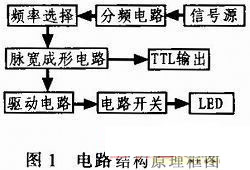 對水下成像系統(tǒng)而言,光源的選擇至關(guān)重要,光源的穩(wěn)定性、均勻性、響應(yīng)速度及其光波波長范圍是系統(tǒng)成像的關(guān)鍵。采用藍光LED所發(fā)出光光經(jīng)過水介質(zhì)——目標反射——水介質(zhì)——接收光學(xué)系統(tǒng),最終在成像傳感器(CCD,ICCD)上成像。這就決定了LED必須工作在快脈沖驅(qū)動方式下,目前市場上的驅(qū)動電路一般均丁作在慢脈沖驅(qū)動模式(μs量級),遠不能滿足我們的要求。因此,我們必須自己解決快脈沖驅(qū)動電路這一難題,尤其是實現(xiàn)以ns量級的大功率快脈沖來驅(qū)動大功率的LED?;谶@種實驗實際需求,我們研究開發(fā)了此種快脈沖驅(qū)動電路。該電路的基本功能是產(chǎn)生低頻、快速、大功率驅(qū)動電流脈沖信號,輸出脈沖的頻率與周期精確度高,穩(wěn)定性好,脈沖信號寬度在20~100 ns內(nèi)分5檔可調(diào),輸出在50 Hz的基準頻率下工作。脈沖信號通過驅(qū)動電路,輸出一個快脈沖信號驅(qū)動輸出電流開關(guān),產(chǎn)生一個大電流脈沖信號驅(qū)動一個大功率LED。為了達到設(shè)計要求和目的,我們采用晶振電路產(chǎn)生高精度頻率/周期基準脈沖作為內(nèi)置信號源,通過對基準脈沖進行多次分頻,產(chǎn)生所需頻率的輸出脈沖信號,這樣可以獲得頻率穩(wěn)定的脈沖信號,同時實現(xiàn)了頻率選擇。經(jīng)過分頻后的脈沖信號再經(jīng)過脈沖寬度成形電路實現(xiàn)脈寬調(diào)節(jié),然后經(jīng)過電流開關(guān)電路,產(chǎn)生大電流脈沖,使LED發(fā)光。該驅(qū)動電路主要由以下幾個部分組成:信號源、分頻電路、頻率選擇、脈沖寬度電路、TTL輸出、驅(qū)動電路和電流開關(guān)電路。其框圖如圖1所示。