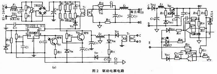 基于IRIS4011的電路由輸入保護電路,EMI抑制電路,輸入整流濾波電路,直流變換電路,輸出濾波電路,輔助供電電路,二次恒壓/恒流反饋電路組成。輸入電壓:85~264 VAC;輸入頻率47~63 Hz;輸出電壓5~24 VDC;輸出電流2.5 A;恒流精度±2.5%;最大輸出功率:60 W。利用變壓器的電感與瓷片電容實現(xiàn)準諧振工作模式,電路簡單,可靠性高。準諧振控制模式,能提高電路的轉(zhuǎn)換效率,降低EMI干擾。用放大器來實現(xiàn)恒壓、恒流控制,可以得到很高的控制精度。在輸出電流比較大的電路中,必須用放大器控制形式才能提高控制精度與提高電路轉(zhuǎn)換效率。限于篇幅,把電路圖分成2部分,具體的電路如圖2所示。