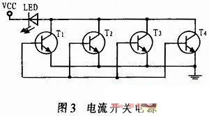 通過成形電路的信號,控制大功率藍光LED發(fā)光,驅(qū)動信號控制電流開關(guān)。電流開關(guān)選用一種大功率高頻三極管,為了滿足LED驅(qū)動電流的需求,將4只三極管并聯(lián),使流過LED的脈沖電流最大達到2.5 A,保證了LED在額定功率下工作,達到穩(wěn)定光源的目的。在輸入驅(qū)動信號的作用下,三極管進入導(dǎo)通狀態(tài),LED兩端產(chǎn)生一定的壓降,大電流流過LED,使大功率藍光LED發(fā)光,作為距離選通水下成像系統(tǒng)的光源,電路如圖3所示。