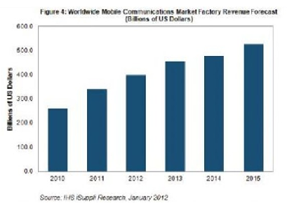 2012年移動(dòng)通信市場(chǎng)的工廠營(yíng)業(yè)收入預(yù)計(jì)達(dá)到3980億美元,比去年的3408億美元增長(zhǎng)17%。盡管今年的增長(zhǎng)速度比2011年的32%有所放緩,但總體市場(chǎng)并未顯示出即將下滑的跡象。預(yù)計(jì)明年將保持兩位數(shù)的增長(zhǎng)速度,工廠營(yíng)業(yè)收入到2015年將突破5000億美元,如圖所示。工廠營(yíng)業(yè)收入是指制造商通過(guò)向渠道銷(xiāo)售設(shè)備而獲得的收入,在本案中,廠商銷(xiāo)售的是移動(dòng)通信設(shè)備,如智能手機(jī)以及其它類(lèi)型的手機(jī),或者路由器等無(wú)線基礎(chǔ)設(shè)備。