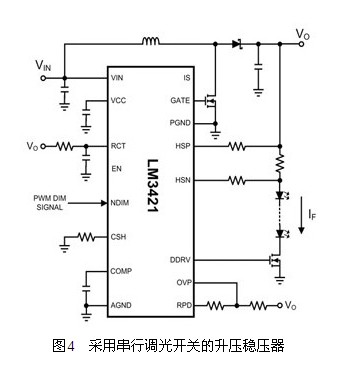 假如真的需要一個快速的PWM調(diào)光,最佳的解決方案是采用兩級系統(tǒng),并以降壓穩(wěn)壓器作為第二級LED驅(qū)動級。不過,若尺寸空間和成本都不容許,退而求其次的最佳選擇便是圖4中的串行開關(guān)。
