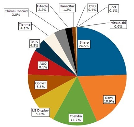 夏普、索尼、東芝等日本液晶顯示器制造商都專注于發(fā)展車用液晶顯示屏,不僅因為這些公司有能力產(chǎn)出高質(zhì)量的中小尺寸面板,也可以取得較高獲利空間。在車載應(yīng)用上,夏普為領(lǐng)先廠商,擁有24.5%的市占率;索尼居次,為18.9%;東芝則有14.7%的市占率。