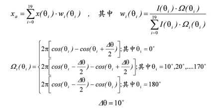 在量測θ=0°和90°(或更多的θ角)的色度坐標(biāo)和光強(qiáng)度時(shí),首先在每個(gè)θ角上取平均,表示為x(θi)、y(θi)以及I(θi),這里的θi=0°、10°、20°等直到180°。然后平均色度坐標(biāo)xa由下列加權(quán)平均式子算出,量測示意圖如圖13。