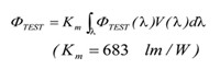 yaux,TEST (λ)為不點(diǎn)亮待測樣品,點(diǎn)亮輔助燈,在此系統(tǒng)下的光譜輻射計(jì)的讀值;yaux,REF (λ)則為不點(diǎn)亮參照標(biāo)準(zhǔn)燈,點(diǎn)亮輔助燈時(shí),在此系統(tǒng)下的光譜輻射計(jì)讀值。從測得的ΦTEST (λ)(單位:W/奈米)總分光輻射通量,可使用公式(3)計(jì)算總光通量 ΦTEST (單位:流明)。