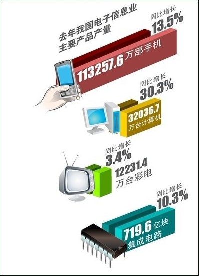 近日,工信部發(fā)布《2011年電子信息產(chǎn)業(yè)統(tǒng)計公報》,在2011年,我國彩電、手機、計算機等主要電子產(chǎn)品產(chǎn)量占全球出貨量的比重分別達(dá)到48.8%、70.6%和90.6%,均名列世界第一。