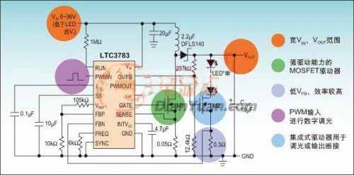 圖:基于LTC3783的大功率PWM LED驅(qū)動電路