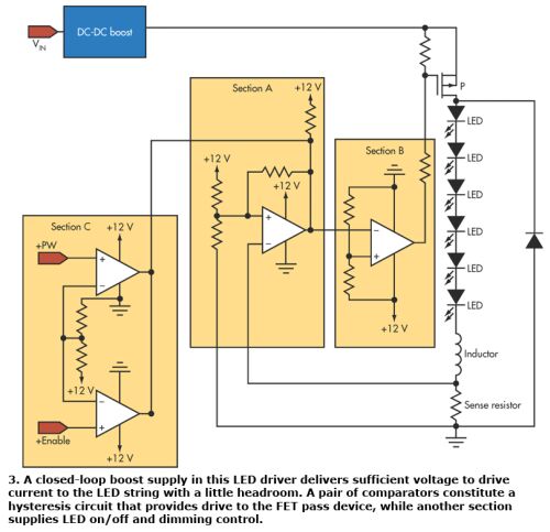 DC-DC升壓變換器是一個(gè)閉環(huán)升壓電源,它提供了足夠的電壓(至少2V的余量)來(lái)驅(qū)動(dòng)流向LED串的電流。圖中A部分顯示了一個(gè)比較器及構(gòu)成正向滯后電路的相關(guān)電阻。圖中將感測(cè)電阻上的電壓與一個(gè)已知參考值作比較。圖中B部分給出了另一個(gè)比較器和用于緩沖A部分輸出相關(guān)電阻,以確保正確的滯后處理并驅(qū)動(dòng)直通器件。