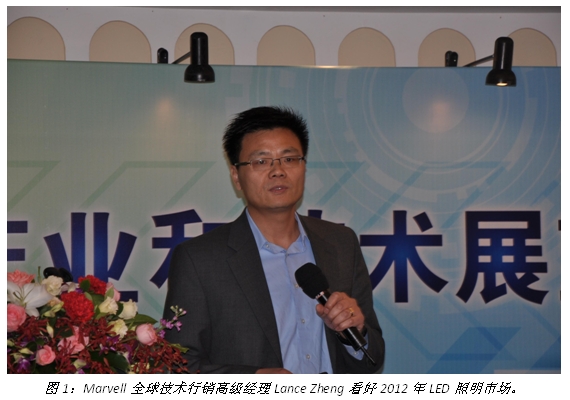 有業(yè)內(nèi)人士說,2011年LED庫存過大,會(huì)使2012年的市場(chǎng)不如2011年。對(duì)此觀點(diǎn),Marvell公司全球技術(shù)行銷高級(jí)經(jīng)理Lance Zheng有不同看法,“國(guó)內(nèi)裝機(jī)量非常多,這個(gè)是造成產(chǎn)能過剩的原因,但提高光效會(huì)是刺激LED行業(yè)發(fā)展的非常好的方式,因?yàn)楣庑б惶岣咚玫腖ED數(shù)量就會(huì)小,因此能降低成本,促進(jìn)LED市場(chǎng)發(fā)展。至于說2012年整個(gè)產(chǎn)業(yè)應(yīng)該還是保持增長(zhǎng),這里的亮點(diǎn)就是LED照明。”他在“2012產(chǎn)業(yè)和技術(shù)展望媒體研討會(huì)”上這樣表示。