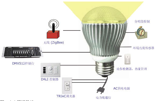 未來照明革新市場潛力巨大,如圖1所示。分時段控制是指在不同時間段有不同的亮度。環(huán)境亮度傳感器可以靈活應(yīng)對燈具所處環(huán)境的亮度,比如天陰的時候天黑的比平常早,那么路燈就會提前打開。動作傳感檢測器是指夜晚的時候如果燈具周圍無人活動時,會調(diào)低亮度,當(dāng)檢測到有人活動時,就會調(diào)高亮度。另外,現(xiàn)代照明需要有多重通信方式,除了無線方式以外,DALI或DMX512等先進(jìn)的照明專用通信協(xié)議使得燈具的管理更加便捷,電力線載波通信(PLC)也是近年來備受關(guān)注的方向。