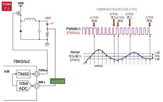 第二種是通過A/D轉(zhuǎn)換器進(jìn)行反饋控制,使用A/D轉(zhuǎn)換器檢測LED電流,通過改變PWM輸出占空比實(shí)現(xiàn)恒流控制。通過改變A/D轉(zhuǎn)換的目標(biāo)值實(shí)現(xiàn)各通道的獨(dú)立調(diào)光,如圖3所示。