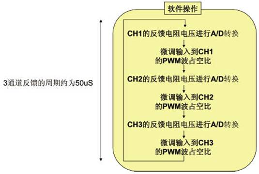 LED恒流控制操作流程圖如圖4所示,如圖,有3通道的LED需要控制,是A/D轉(zhuǎn)換→PWM輸出的微調(diào)的重復(fù)操作。軟件操作過程是對CH1的反饋電阻電壓進(jìn)行A/D轉(zhuǎn)換,微調(diào)輸入到CH1的PWM波占空比,然后對通道2和通道3進(jìn)行同樣操作,重復(fù)上述流程即可。三個通道的A/D轉(zhuǎn)換和檢測調(diào)整的整個周期約為50μs。