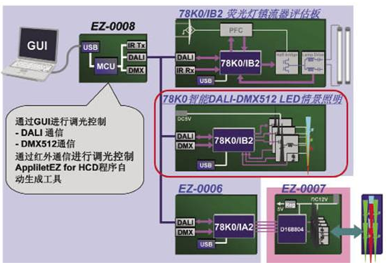 瑞薩電子的照明參考方案由3部分組成,可通過PC端GUI進(jìn)行調(diào)光控制,PC和通信板通過USB線連接,情景照明板和通信板之間可以由紅外、DALI及DMX512三種方式實(shí)現(xiàn),在瑞薩電子的照明參考方案中,可以使用AppliletEZ for HCD程序自動生成工具,實(shí)現(xiàn)照明控制程序的涉及、編譯和燒寫。照明參考方案如圖5所示。
