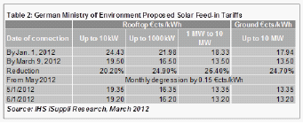 對于2012和2013年,德國政府確認的年度安裝目標(biāo)是2.5-3.5GW,從2014年開始,該目標(biāo)將每年下調(diào)400MW。表2所示為德國環(huán)境部所建議的FIT體系。