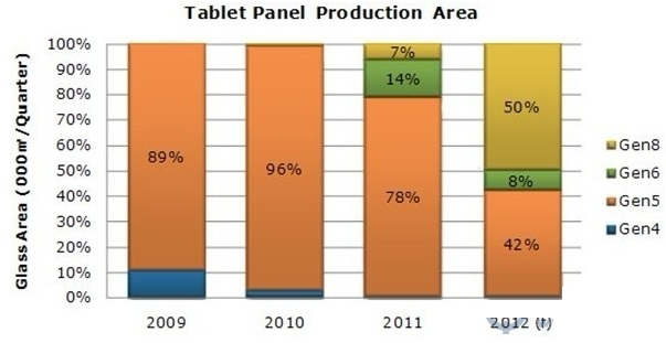 根據(jù)最新一季的季度大尺寸面板生產(chǎn)策略報告(Quarterly Large-Area Production Strategy Report)指出,在2011年前五代線為生產(chǎn)平板電腦面板(9”以上)面積最大的主要產(chǎn)線。然而,在2012年八代線將成為平板電腦面板最主要的生產(chǎn)工廠。