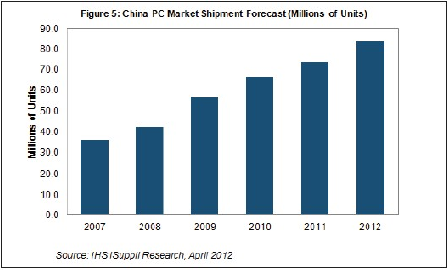 IHS公司預測,2012年中國占全球臺式PC出貨量的份額將從2011年的7%上升到11%。