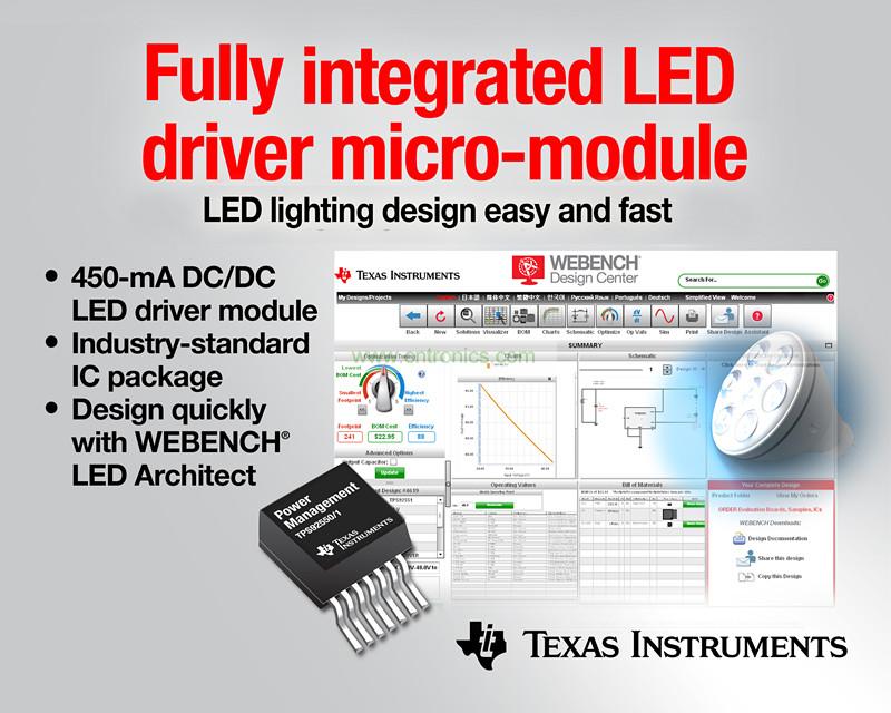 日前,德州儀器 (TI) 宣布推出兩款全面集成型 LED 驅(qū)動器微型模塊,其可消除 LED 驅(qū)動器設(shè)計(jì)中常見的外部組件及復(fù)雜布局安放問題。該 450 mA TPS92550 及 TPS92551 DC/DC LED 驅(qū)動器模塊是業(yè)界率先采用統(tǒng)一 IC 封裝集成所有所需電源及無源電路系統(tǒng)的產(chǎn)品,可為 LED 實(shí)現(xiàn)高達(dá) 23 W 的功率。如欲了解更多詳情,訂購樣片與評估板,敬請?jiān)L問:http://www.ti.com.cn/product/cn/tps92550。觀看視頻,請點(diǎn)擊:http://www.ti.com/tps92550-prv。