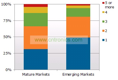 該報告還發(fā)現,在成熟市場家庭平均擁有2.4臺電視,而在新興市場平均每戶為1.8臺。成熟市場中,超過三分之二的家庭有一臺以上電視,但在新興市場近一半的家庭只有一臺電視。鑒于平板電視持續(xù)推出新機種、價格益加實惠、以及消費者對高品質、大屏幕和高清晰度電視的消費欲望,和成熟市場的消費者一樣,越來越多的新興市場消費者購買平板電視(主要是液晶電視)來汰換他們現有的舊款式電視。