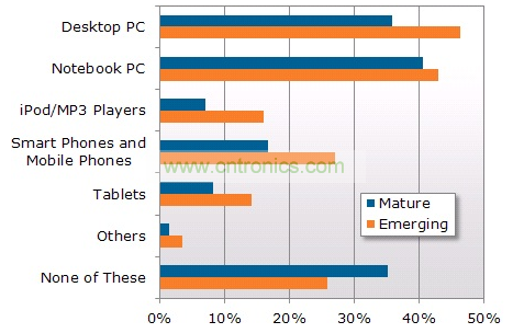 NPD DisplaySearch全球電視消費者換機調查還對家庭戶進行了關于在其他設備上收看電視視頻節(jié)目的調研,發(fā)現在新興市場越來越多的家庭使用除電視以外的設備,包括平板電腦、智能手機和MP3播放器。