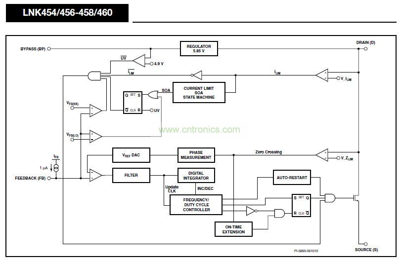 LinkSwitch-PL在一個(gè)器件上集成了一個(gè)高壓功率MOSFET開關(guān)及一個(gè)電源控制器。該IC器件提供單級(jí)功率因數(shù)校正和LED電流控制。LinkSwitch-PL控制器包括一個(gè)振蕩器、反饋(檢測(cè)及邏輯)電路、5.85 V穩(wěn)壓器、遲滯過熱保護(hù)、頻率抖動(dòng)、逐周期限流、環(huán)路補(bǔ)償電路、自動(dòng)重啟動(dòng)、開關(guān)導(dǎo)通時(shí)間延長(zhǎng)、功率因數(shù)以及恒流控制電路。