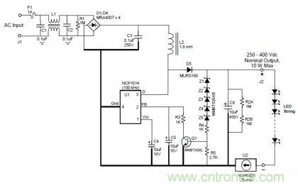美國安森美公司加了一個(gè)功率因素校正芯片NCP1014的恒流二極管的電源,其電原理圖見圖12。