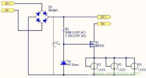 有不少現(xiàn)成的恒流二極管的耐壓往往不夠高,當(dāng)然最簡單的方法就是用兩個(gè)或幾個(gè)恒流二極管串聯(lián)。同樣這樣成本就會(huì)增高。也可以用增加一些其它器件來提高。
