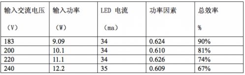 由表中可知,當(dāng)市電電壓在200~225VAC的服務(wù)內(nèi)變化時(shí)基本上可以保持恒流在27.1~27.8mA的范圍內(nèi),而且效率在82.5%~95.79%范圍內(nèi),即使在輸入電壓過低而無法恒流時(shí),它的效率還能高達(dá)98-99%,這是采用恒流二極管的一個(gè)很大的優(yōu)點(diǎn)。