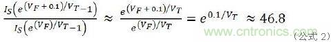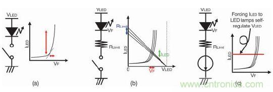 下面是圖1a行不通的原因所在。在公式1中,IS、RS是常數(shù),取決于LED產(chǎn)品本身,與VT是熱電壓無(wú)關(guān)。假設(shè)串聯(lián)電阻RS是理想值零,那么僅0.1V的VF變化就會(huì)產(chǎn)生47倍的ILED差異。