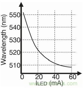 這時(shí)候,需要考慮電流變化對(duì)LED光輸出波長(zhǎng)值的影響。改變波長(zhǎng)就意味著改變?nèi)搜劭吹降纳?。圖4是綠色LED燈的實(shí)例。通常在業(yè)界,510nm 廣泛代表綠色。因此,大部分LED燈制造商所設(shè)計(jì)的LED燈產(chǎn)品在最大額定電流下都具備510nm的波長(zhǎng)。在圖4中,隨著LED電流的升高,波長(zhǎng)可達(dá)到510nm。獲得綠色的最佳方法是盡量使燈的驅(qū)動(dòng)電流接近最大額定值。這也就說(shuō)明了為什么使用數(shù)字控制比使用模擬控制好。