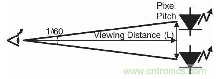 一套LED顯示系統(tǒng)包含大量的LED燈和一個(gè)大電源。設(shè)計(jì)系統(tǒng)時(shí)需要重點(diǎn)考慮LED燈的密度優(yōu)化問(wèn)題。LED 燈的該密度稱(chēng)為每個(gè)像素的距離或像素間距。如果像素間距太密,一旦超出了人眼能識(shí)別的精度,它就不會(huì)改善影像輸出質(zhì)量,而且會(huì)增加成本。人眼可識(shí)別的兩個(gè)單光源是在這兩點(diǎn)形成1個(gè)弧度的1/60(=1 弧分)時(shí)。