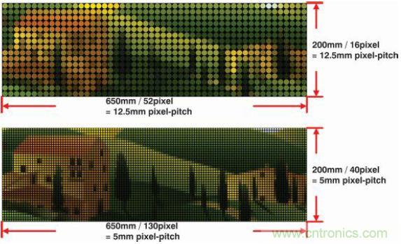 例如,5m視距的系統(tǒng)需要5mm像素間距來(lái)實(shí)現(xiàn)良好分辨率。另一個(gè)視覺(jué)實(shí)例如圖7所示,圖中展示了過(guò)低像素間距如何降低輸出影像質(zhì)量。像素間距為12.5mm 的影像(上)看起來(lái)很粗糙,無(wú)法近距離辨識(shí)。但保持一定的距離觀看時(shí)影像開(kāi)始變得清晰,與觀看像素間距為5mm的影像(下)類(lèi)似。這個(gè)實(shí)例清楚地說(shuō)明了視距與像素間距的關(guān)系。