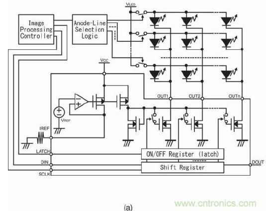 從圖2可以看出,LED燈的陰極采用當(dāng)前市場(chǎng)常見(jiàn)的LED驅(qū)動(dòng)器IC驅(qū)動(dòng)。這里要討論LED燈的陽(yáng)極驅(qū)動(dòng)器電路。陰極采用恒流驅(qū)動(dòng)器有優(yōu)勢(shì),陽(yáng)極希望也只提供足夠的電壓。但仍需做出如何驅(qū)動(dòng)陽(yáng)極的重要決定!