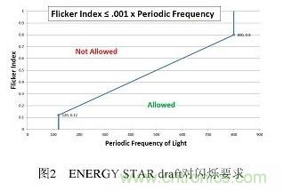 化,人眼到人腦對(duì)這一變化產(chǎn)生的主觀反映。通常閃爍按人的感覺分為可見閃爍和不可見閃爍。頻率大于100Hz時(shí),人眼感受不到閃爍現(xiàn)象,但仍會(huì)造成眼睛疲勞,頭痛等,這就是頻閃效應(yīng)。普遍認(rèn)為500Hz以內(nèi)都存在該效應(yīng)。對(duì)此,美國能源之星在調(diào)光性能的要求中規(guī)定了閃爍需滿足的條件,使用于所有燈具。如下圖所示: