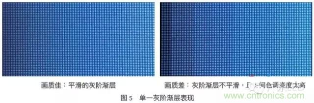小點間距LED顯示屏為時序掃描式(multiplexed)的顯示器,非液晶屏幕的hold-type顯示器,所以刷新率對于小點間距LED顯示屏來說相當?shù)刂匾^低的刷新率不僅會使小點間距LED顯示屏觀賞起來有閃爍的不適感,容易使造成觀賞者暈炫,而且會使灰階漸層的效果不平滑。以圖4為例,右圖臉部的灰階漸層效果較左圖的不平滑,有類似等高線的現(xiàn)象,從圖5的灰階漸層測試畫面也可以看出右圖的小點間距LED顯示屏的連續(xù)性比左圖的差。