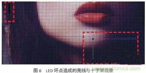 現(xiàn)今的LED磊晶與封裝技術與日俱增,但LED經過長時間的使用后仍難免會有損壞,與液晶屏幕不同的是,壞掉的LED會在小點間距LED顯示屏形成亮線或是十字架,而不是一個黑點,如圖6所示。對LED顯示屏制造商,營運商與觀眾而言,都是一大困擾。