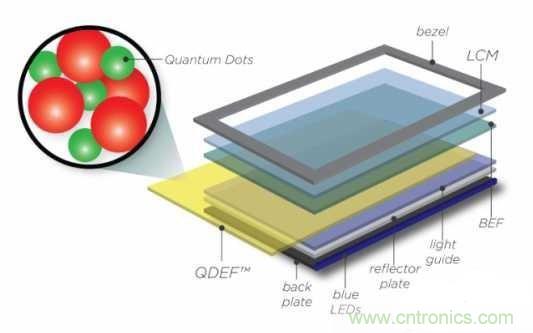 但如果是通過量子點進行顯色的話,就不需要進行白光背光,原因有兩個(其實算起來應該算一個):光致發(fā)光的原因,藍光量子點無法登場,所以在背光中必須加入藍色光源,其二,是因為目前的量子點只負責產(chǎn)生綠光和紅光,所以必須將原背光模組中的白光LED換成藍光LED。