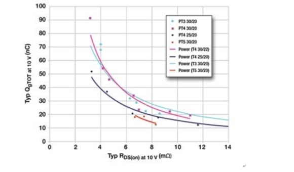RDS(ON)直接與傳導(dǎo)損耗有關(guān),而Qg直接與開關(guān)損耗有關(guān)。FOM越小,性能越好。