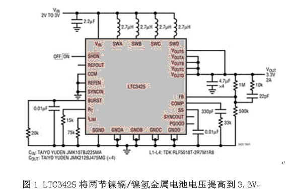 例如,考慮單片、同步、高開關(guān)頻率(每相高達(dá)2MHz)、四相電源集成電路架構(gòu)。這類產(chǎn)品的一個例子是LTC3425,如圖1所示。它允許使用多個體積小、成本低的電感器,而不是單個又大、又笨重的電感器,而且與同類單相電路相比,需要少得多的輸出濾波器電容,因為有效的輸出紋波頻率高達(dá)8MHz。此外,所需的全部功率MOSFET都在芯片內(nèi)。這非常適用于需要使用扁平組件以及空間受限的電路板和便攜式設(shè)備。