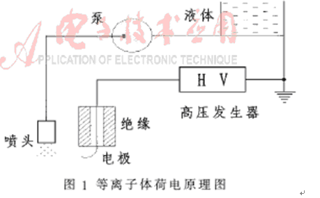 圖1所示為等離子體荷電原理圖,當(dāng)在電極上施加一定的脈沖高壓時(shí),窄脈沖電暈放電中產(chǎn)生的高能電子能使氣體電離成正、負(fù)離子,同時(shí)在空間電場(chǎng)中,由于高壓脈沖上升沿陡峭,電子可瞬間加速,而離子幾乎不加速。在這種放電等離子體中,電子溫度特別高,可形成大量的激發(fā)態(tài)分子,各種極富反應(yīng)的自由基將會(huì)引發(fā)氣體分子電離。在電極附近,極性與電極極性相異的離子被電極吸附,與電極極性相同的離子受電排斥并在周圍形成離子區(qū)[1]。當(dāng)藥液在泵或其他外力的作用下由噴頭霧化后形成霧滴并通過(guò)電離區(qū)與離子碰撞時(shí),就把電荷傳給霧滴,使霧滴荷電。而霧滴又對(duì)離子產(chǎn)生排斥力,使充電速度下降,直至充電停止而達(dá)到飽和。